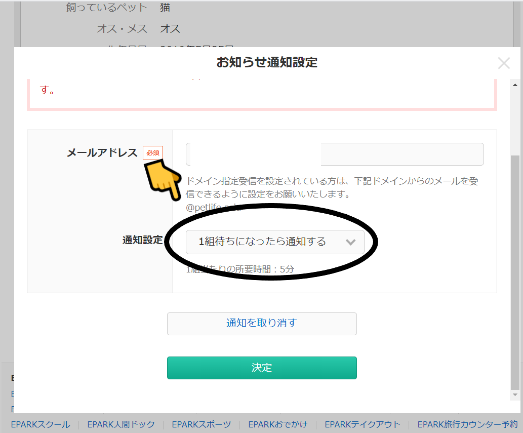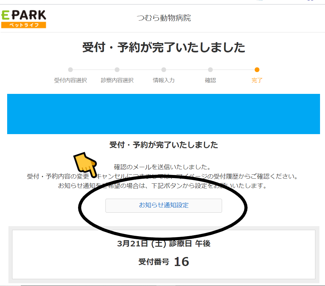 こんにちは☀ 看護師 北野です🙋   今日は、ネット予約時の『お知らせ通知設定』について 詳しくお伝えしたいと思います!   ネット予約をしてくださっていても、 『お知らせ通知設定』がうまくできていないと 「ちゃんと予約をとって来院したのに順番がまだまだ💦」 「気づいたら順番がすぎてしまってる😲」 ということになってしまいます(;_;)   そうならないために!   ① 「受付・予約が完了いたしました」の画面にある、 「お知らせ通知設定」をクリック!       ② メールアドレスを入力し、 何組待ちで通知を受けるか設定し決定をクリック! ※1組 約10分とお考え下さい。       これで、設定した待ち組になりましたらメールが届くようになります! メールが届いたタイミングでご自宅を出発してください✨   ご不明な点がありましたら、お問合せください(*^^*)