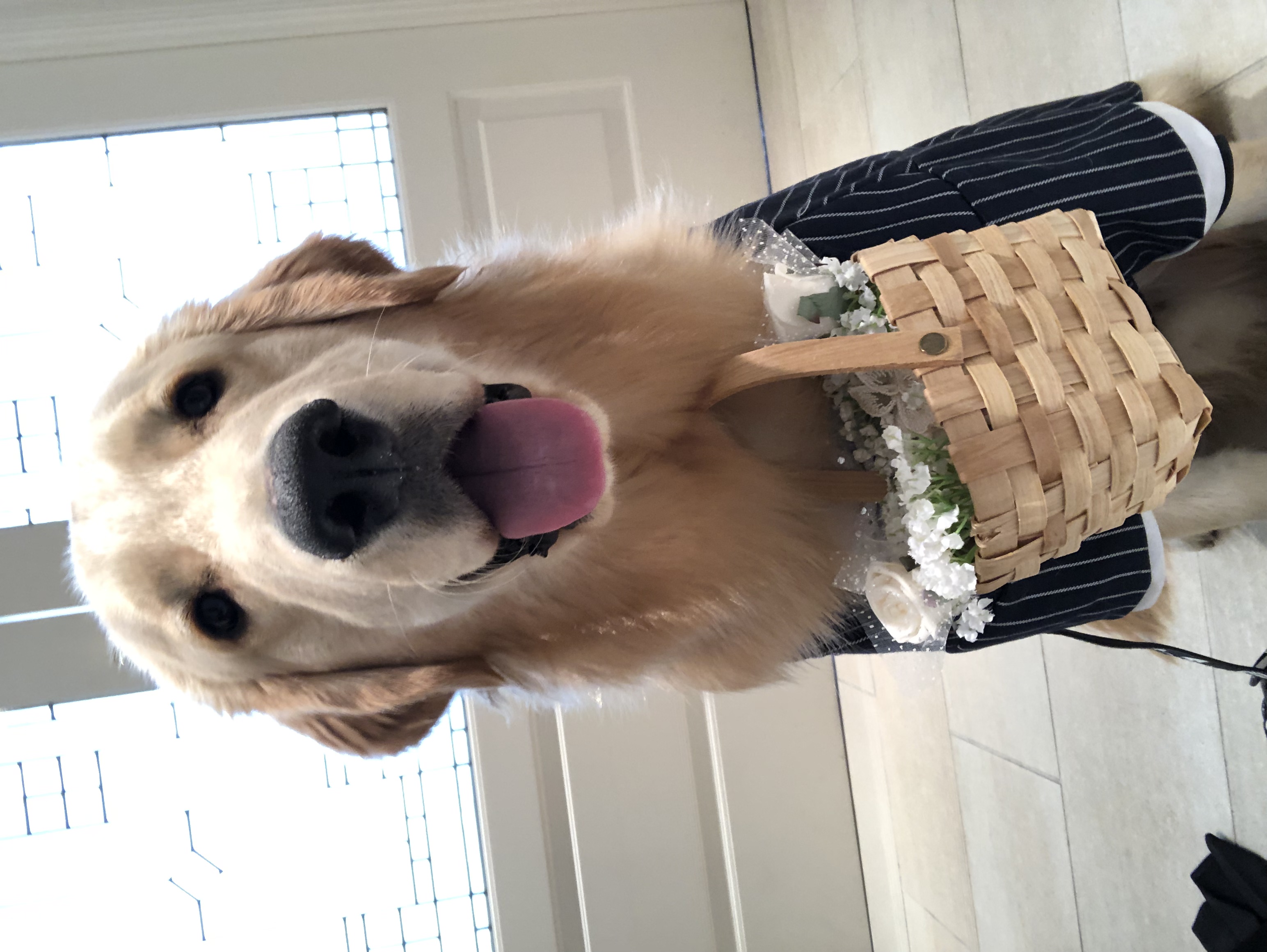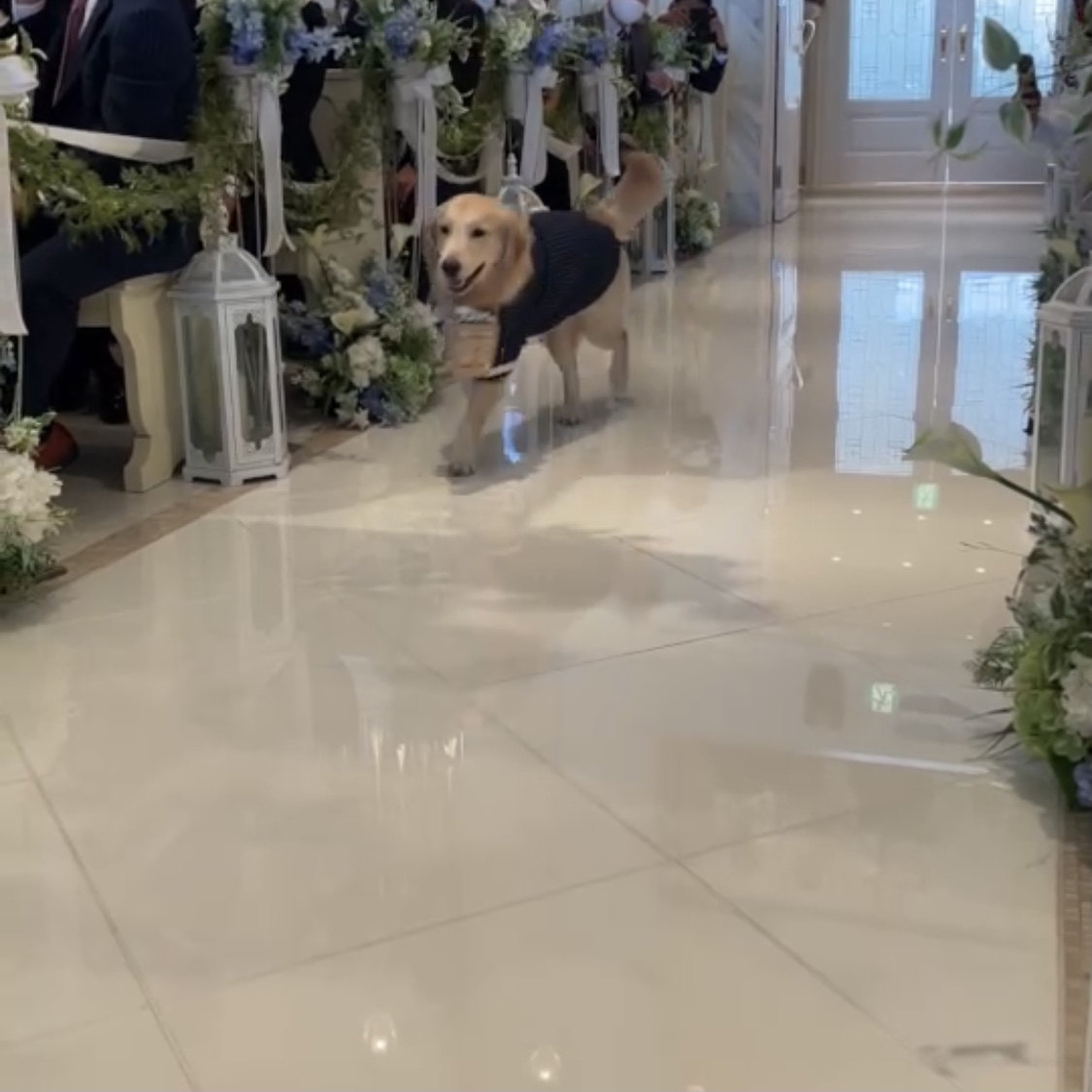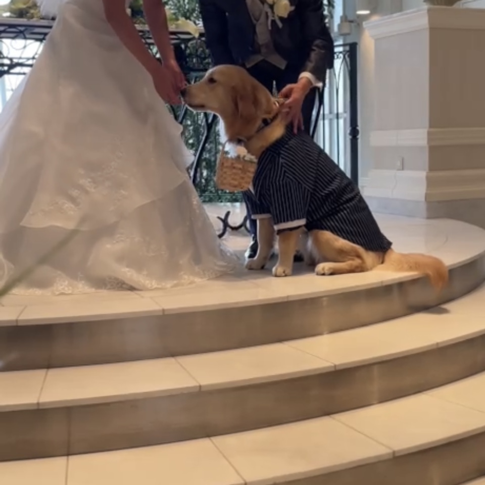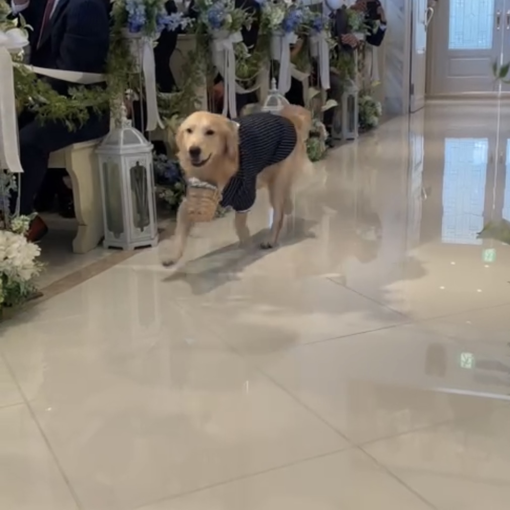 こんにちは!看護師内田です☀   この間妹の結婚式がありまして、 そこでボンドがリングドッグ🐕💍という大役を任されました~✨   本当は去年、ココがリングドッグをするはずだったんです😞 コロナで結婚式が1年延期→ココが天国へ🌈→ボンドが我が家へ🏠 とボンドがすることに🐕💨     タキシード着て準備万端✨ 本当は口でかごをくわえて持っていってほしかったのですが、 途中で落としてしまうので首にかごをぶらさげられたボンド(笑)     スタンバイ中です🌼 私は扉が開くまでの「おすわり、まて」をさせる係でした👍 なので登場シーンは後ろからこっそり見てるだけ、、、 弟に、「しっかり動画撮っといてよ~~!」と念をおしておきました🌞     扉が開いたらひとりでGO🐕✨(↑動画をスクショしたので画質が荒いですが) 途中でちょっとだけ脱線しました、、、😂   無事、持っていくことができました💍💕 挙式が終わったあとの親族での写真撮影だったり、 全部ボンドも参加させてもらってそのあとの露宴中もケージで賢く待っててくれました☺   ボンド、よく頑張った~👏✨お疲れ様🎶