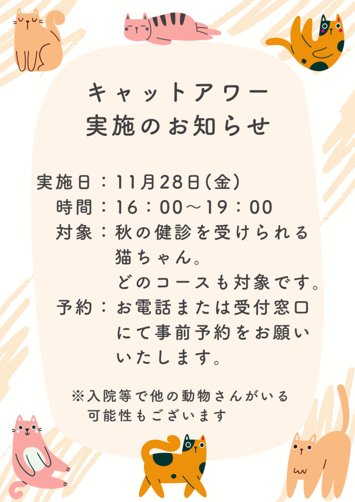 下記の時間は前日までの事前予約が必要です。 ・12:00〜16:30 検査・手術・往診 ・16:30〜17:00 時間予約診療 金曜日が祝日の場合は午後診療はありません。 ※祝日は祝日診療費として別途1,100円かかります。
