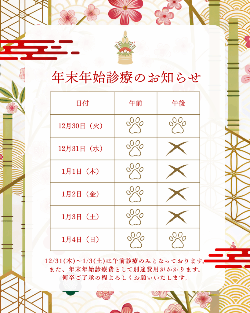 (薬やフードの受け取りや注文などは12/30(火)まで、もしくは1/4(日)以降でお願いいたします)